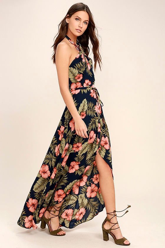 Navy Blue Floral Dress Wedding / Navy Floral Print Dress - Wrap Dress - Side Slit Maxi Dress - Navy blue isn't just magical on table linens, flowers, and bridesmaid dresses, it's totally exciting.